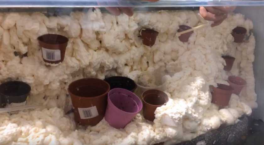 - Распределите тонким слоем почву поверх активированного угля, делая небольшие углубления для корней.