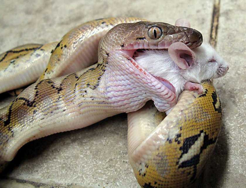 Общее правило кормления змей любой породы — избегать давать добыче предметы, которые больше самой широкой части тела змеи. Хотя вы никогда не должны кормить удавов или питонов вручную, вам также следует избегать трогать их как минимум в течение дня после того, как они поели. Если у змеи не будет достаточно времени, чтобы переварить свою добычу, велика вероятность срыгивания.