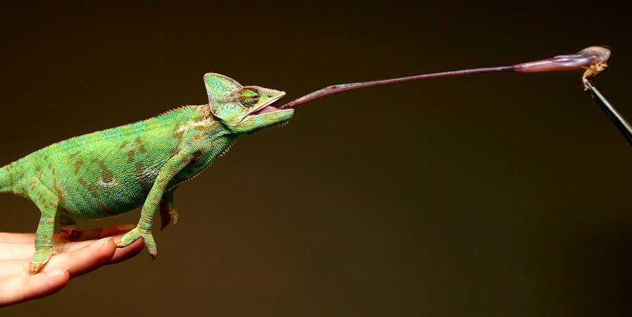 Хамелеон – прекрасный охотник, обладающий длинным, липким языком. Длина языка сопоставима с длиной всего тела до кончика хвоста. Во время охоты, хамелеон стремительно выбрасывает язык в сторону добычи, которая оказывается в липкой ловушке.