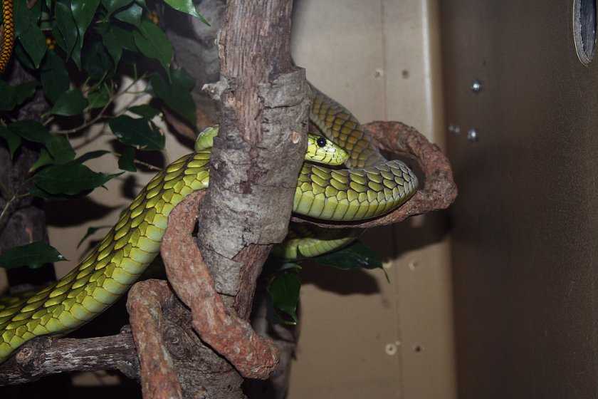 - освещение должно быть ярким, чем светлее, тем лучше, потому что зелёная мамба — дневной охотник;