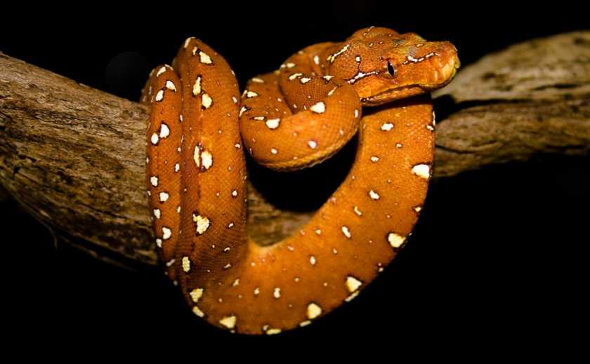 - Новогвинейская ковровая змея встречается как в лесах Гвинеи, так и в Австралии, любит селиться около воды. Рождаясь красновато – коричневыми, питончики с возрастом приобретают свою потрясающую черно-желтую окраску. Встречаются питоны, имеющие оттенки бананового, карамельного, красного, пятнышки могут быть мелкими и крупными, слияние напоминает китайские иероглифы.