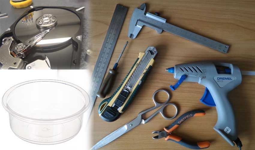 - вращательный элемент колеса можно сделать из шпинделя, взятого из жесткого диска, или применить двигатель старого дисковода. Его необходимо плотно прикрепить ко дну емкости термоклеем;