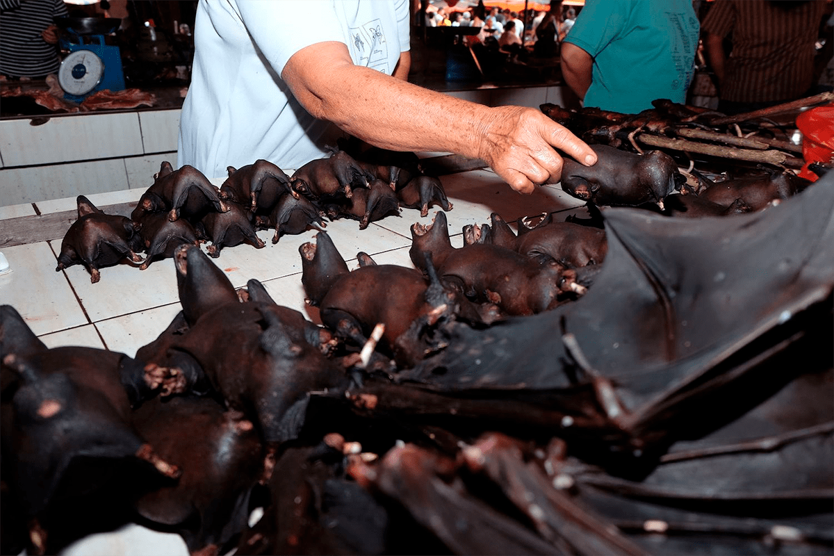 Рисунок 4. Прилавок с тушками летучих лисиц на одном из влажных рынков в Индонезии